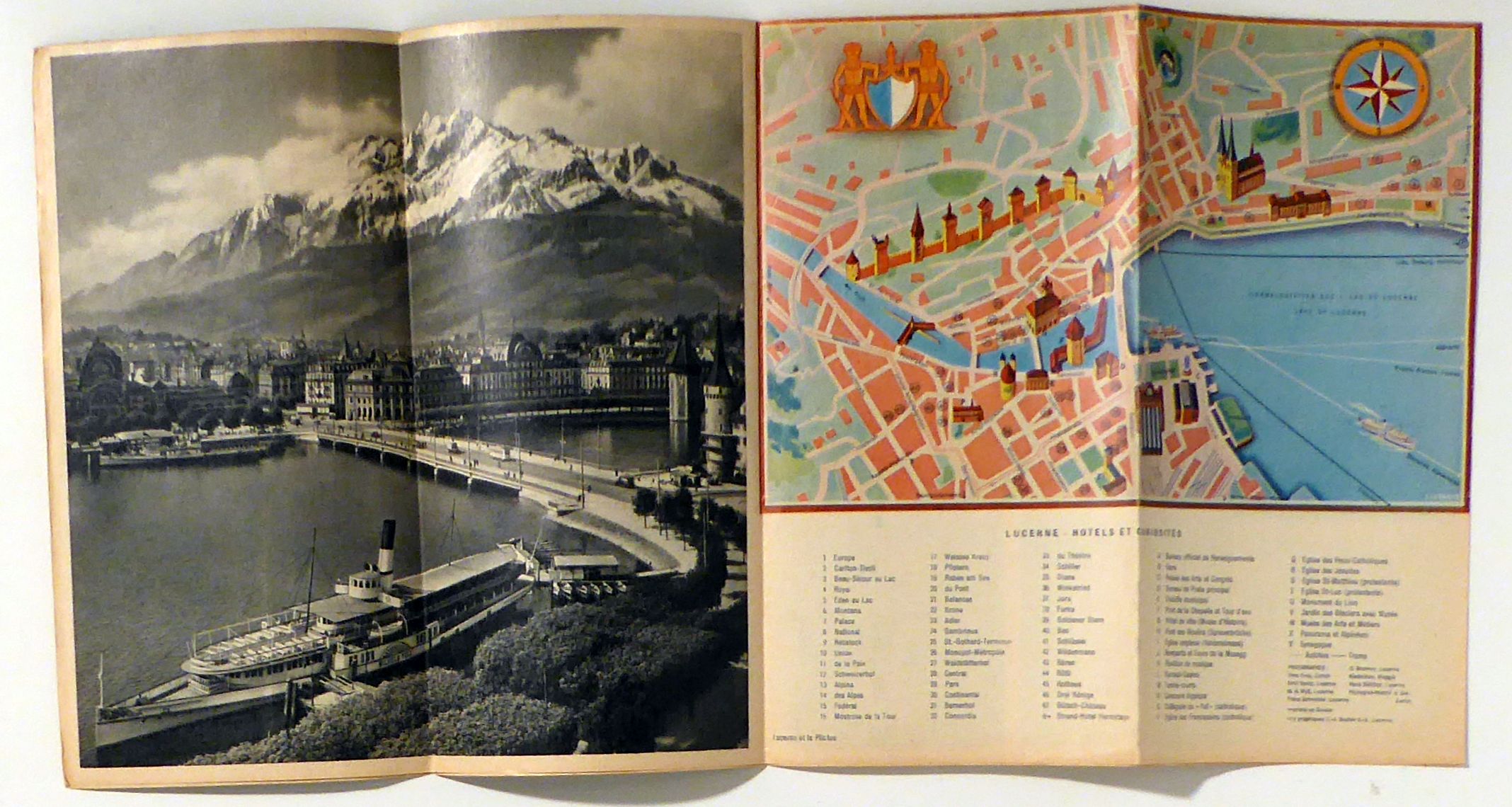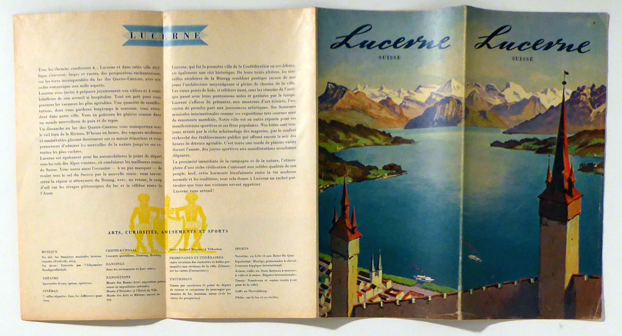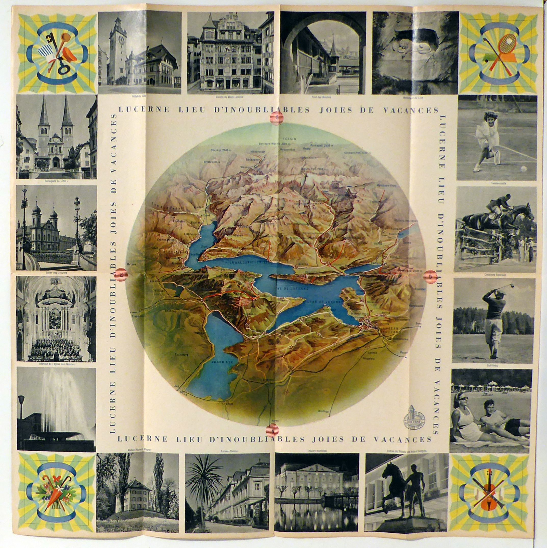 Suisse. Luzern: C. J. Bucher, o.J.. 1 Bl., vierfach gefalteter quadratischer Prospekt mit einer Vogelschaukarte, 17 s/w-Abbildungen nach Fotografien, einem Stadtplan und einer mehrfarbigen Illustration. Einband: Einblatt. Format: 42 x 42 cm. Französische Version eines Tourismusprospekts für Luzern. Mit Fotografien von Theo Frey, Max A. Wyss und anderen. Die Vogelschaukarte ist nach Süden ausgerichtet. Die grafische Gestaltung erinnert an die Landi-Grafik