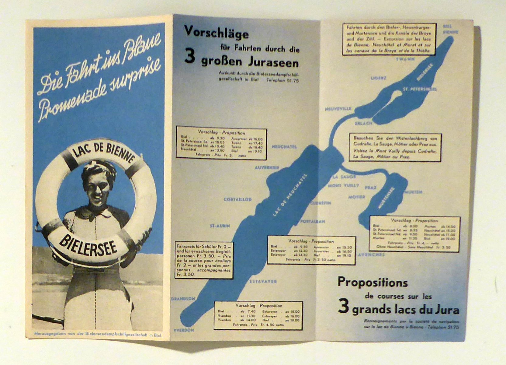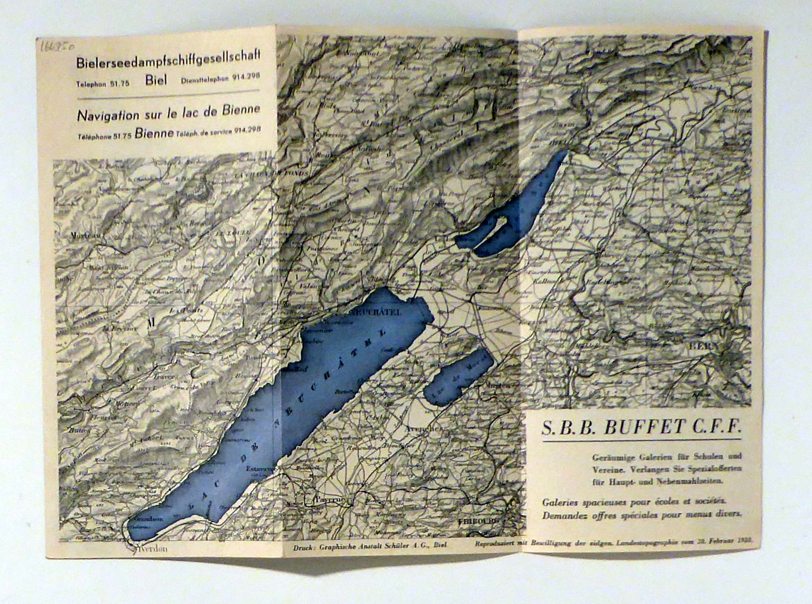 Lac de Bienne Bielersee. Biel: Schüler, 1938. 1 Bl., Einband: Einblatt. Format: 29 x 21 cm (bxh). Herausgegeben von der Bielerseedampfschiffgesellschaft in Biel. Mit einer zweifarbigen geografischen Karte sowie einer schematisierten Karte von Lac de Neuchâtel, Bielersee und Murtensee mit Ausflugsvorschlägen mit Fahrplan und Billetkosten