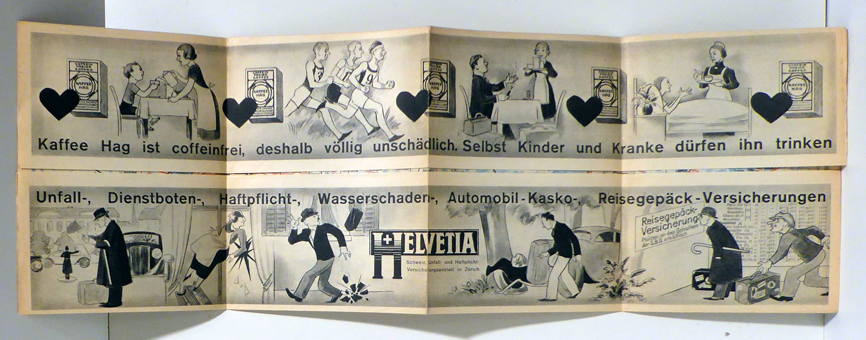 Bahn, Post-Auto, Alpenposten, Schiff. Züprich: Fretz, 1935. 1 Blt., mehrfach gefaltet, Einband: Einblatt. Format: 53 x 33 cm (bxh). Beilage zu "Kursbuch Bürkli" (hier nicht vorhanden). Auf der Rückseite der dreifarbigen Karte mit den verzeichneten Strecken und den dazugehörenden Nummern, mehrere Anzeigen - in Comic-Form für Kaffee Hag und Helvetia Versicherung - sowie eine Karte "Internationales Luftverkehrsnetz der Schweiz 1935"