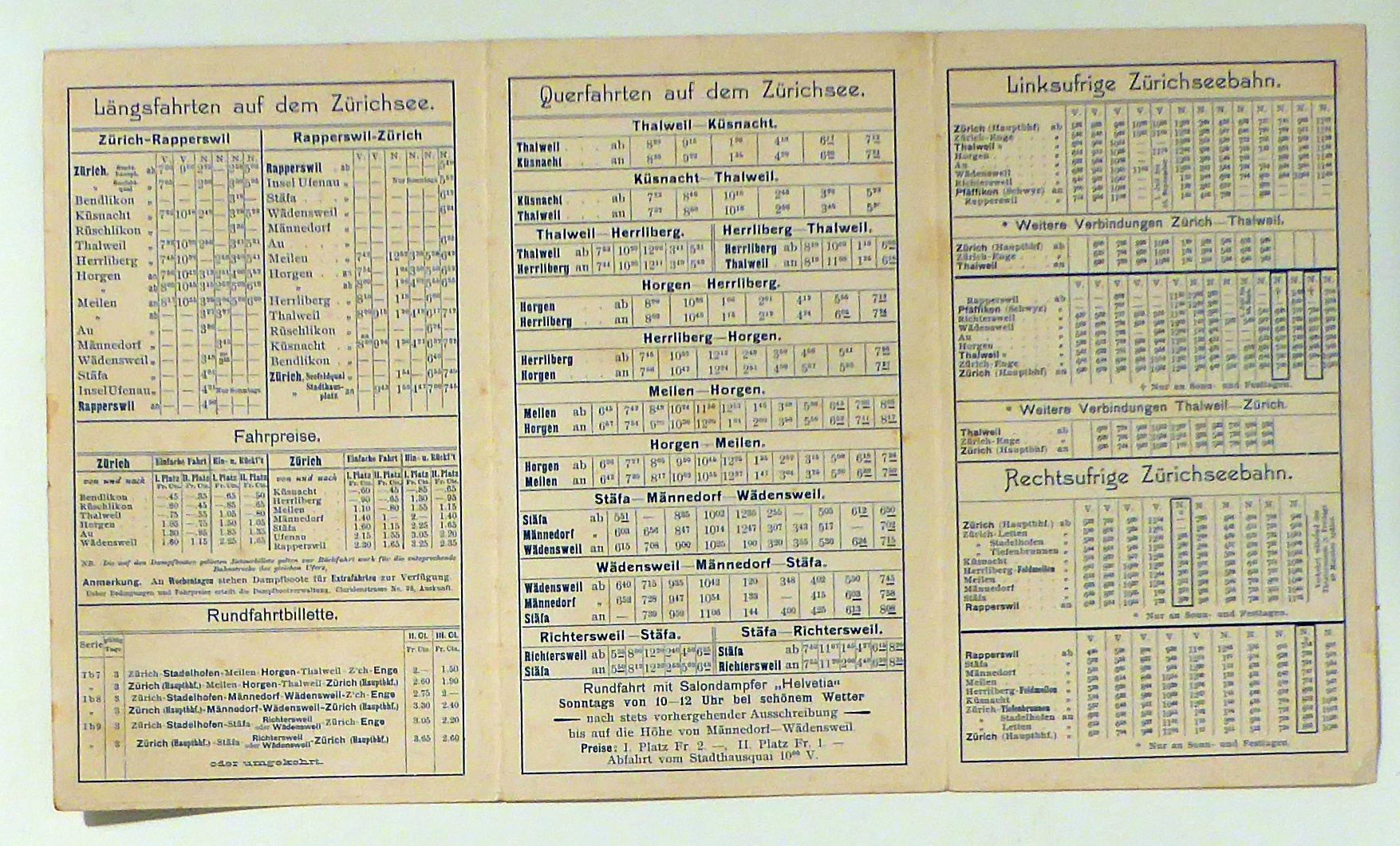Sommerfahrtenplan 1897. o.O.: o.V., 1897. 1 Blatt, doppelt gefaltet, Einband: lose Bogen. Format: 33 x19 cm (bxh). Erstausgabe. Auf der Vorderseite mehrfarbig lithographiertes Panorama mit Sicht von Vrenelisgarten bis zum Düssistock und einer vereinfachten Karte des Zürichsees mit einer Trachtenfrau und zwei städtischen Frauen am Reeling neben dem Kapitän. Auf der Rückseite Fahrpläne mit Preisen für "Längsfahrten" und "Querfahrten" auf dem Zürichsee sowie für die linksufrige und die rechtsufrige Zürichseebahn (der Schweizerischen Nordostbahn) für den Sommer 1897. Aus dem Archiv der Lithographieanstalt Hofer & Burger, aber nicht bei Hauri (Hofer & Burger). Möglicherweise wurde das Blatt, wie eine spätere Version von 1900 bei Hubacher und Biedermann, Bern, hergestellt
