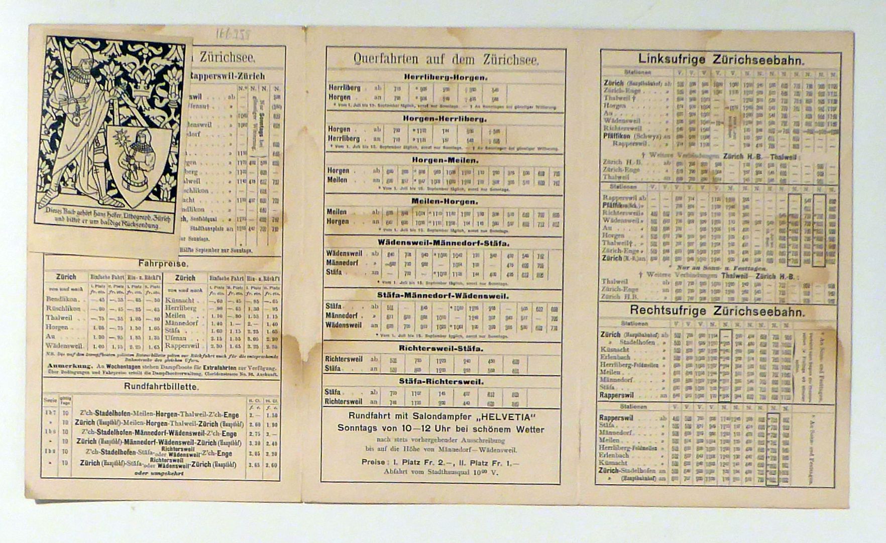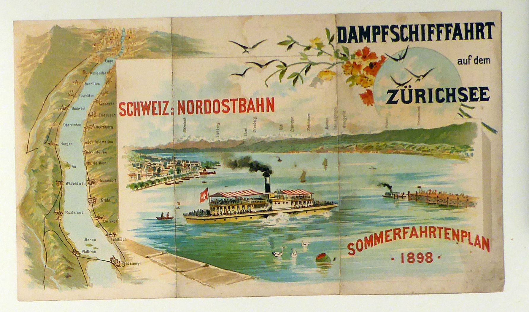 Schweiz: Nordostbahn Sommerfahrtenplan 1898. o.O.: o.V., 1897. 1 Blatt, doppelt gefaltet, Einband: lose Bogen. Format: 33 x19 cm (bxh). Erstausgabe. Auf der Vorderseite mehrfarbig lithographiertes Panorama mit Sicht von Glärnisch bis zum Bristenstock und einer Vogelschaukarte des Zürichsee, eingezeichnet die Eisenbahnlinien. Im Vordergrund des Panoramas eine Sicht auf das linke Uferqui und rechts auf den Schiffssteg am Bürkliplatz, auf dem See eingeklinkt ein vollbesetzter Raddampfer. Auf der Rückseite Fahrpläne mit Preisen für "Längsfahrten" und "Querfahrten" auf dem Zürichsee sowie für die linksufrige und die rechtsufrige Zürichseebahn (der Schweizerischen Nordostbahn) für den Sommer 1898. Aus dem Archiv der Zürcher Lithographieanstalt Hofer & Burger, montiert das Exlibris von Hans Hofer. Nicht bei Hauri (Hofer & Burger). Möglicherweise wurde das Blatt, wie eine spätere Version von 1900 bei Hubacher und Biedermann, Bern, hergestellt