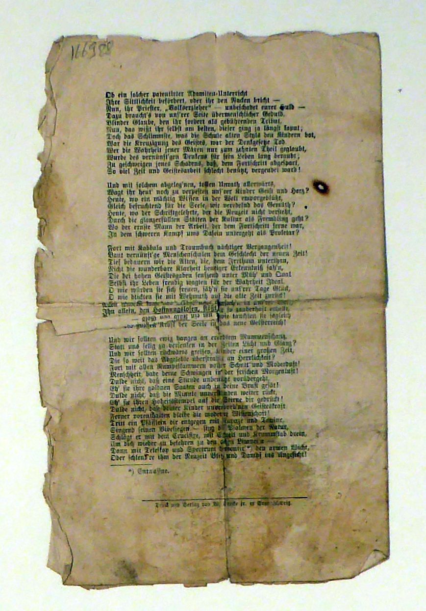 Von Dr. Hermann Krasser in Hermannstadt in Siegenbürgen. Braunschweig: W. Bracke jr., um 1870. [4] S., Einband: loser Bogen. Format: 8°. Vermutlich eine der ersten Versionen als Separata. Erstmals war das Gedicht 1969 in den "Siebenbürgischen Blättern" abgedruckt worden. Selten, gedruckt in Fraktur
