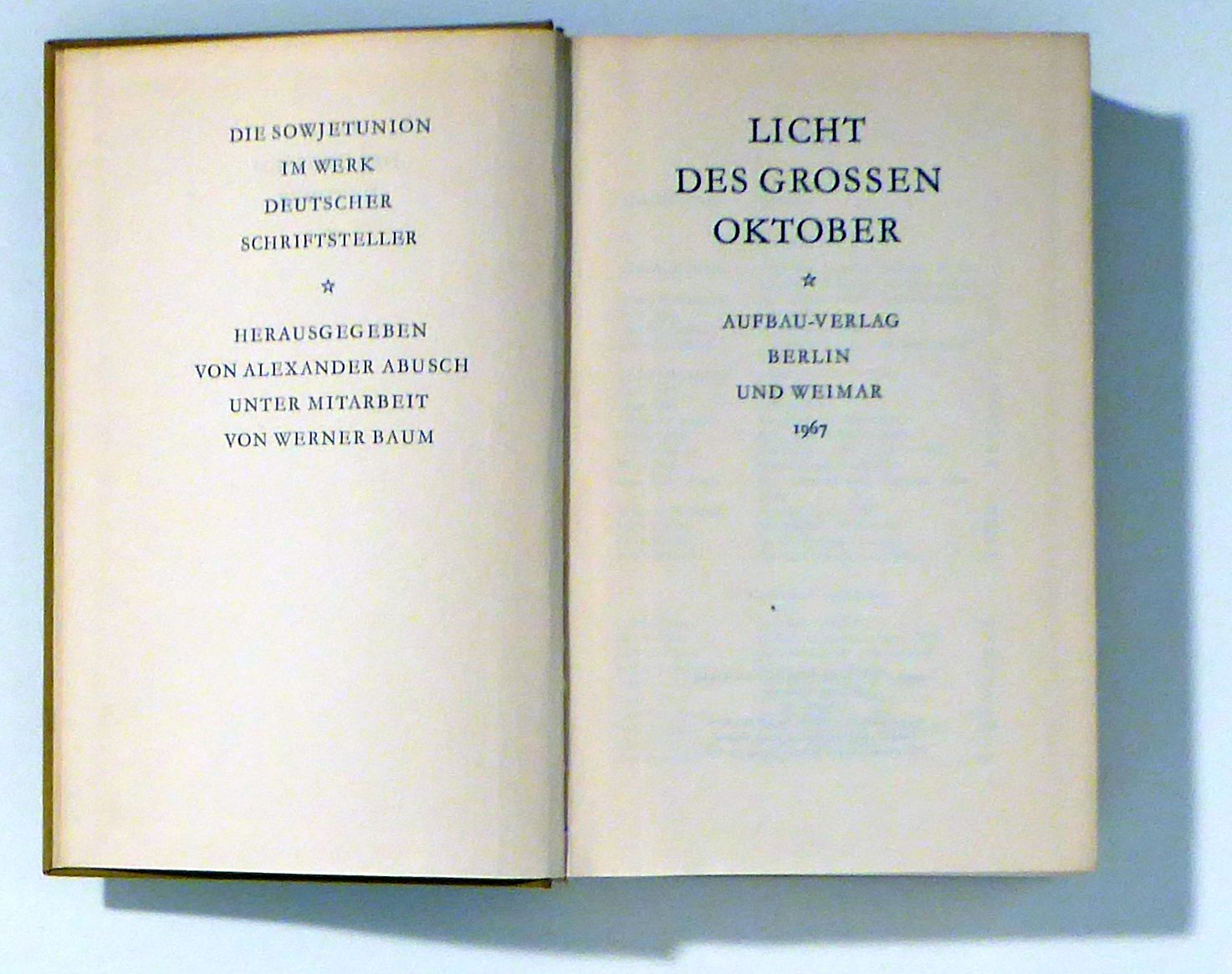 Die Sowjetunion im Werk deutscher Schriftsteller. Herausgegeben von Alexander Abusch unter Mitarbeit von Werner Baum. Berlin und Weimar: Aufbau, 1967. 786, [3] S., Einband: Original-Leinwand. Format: 8°. Erstausgabe. Mit Prosa, darunter auch Auszügen, Gedichten und Liedern von und über die Sowjetunion