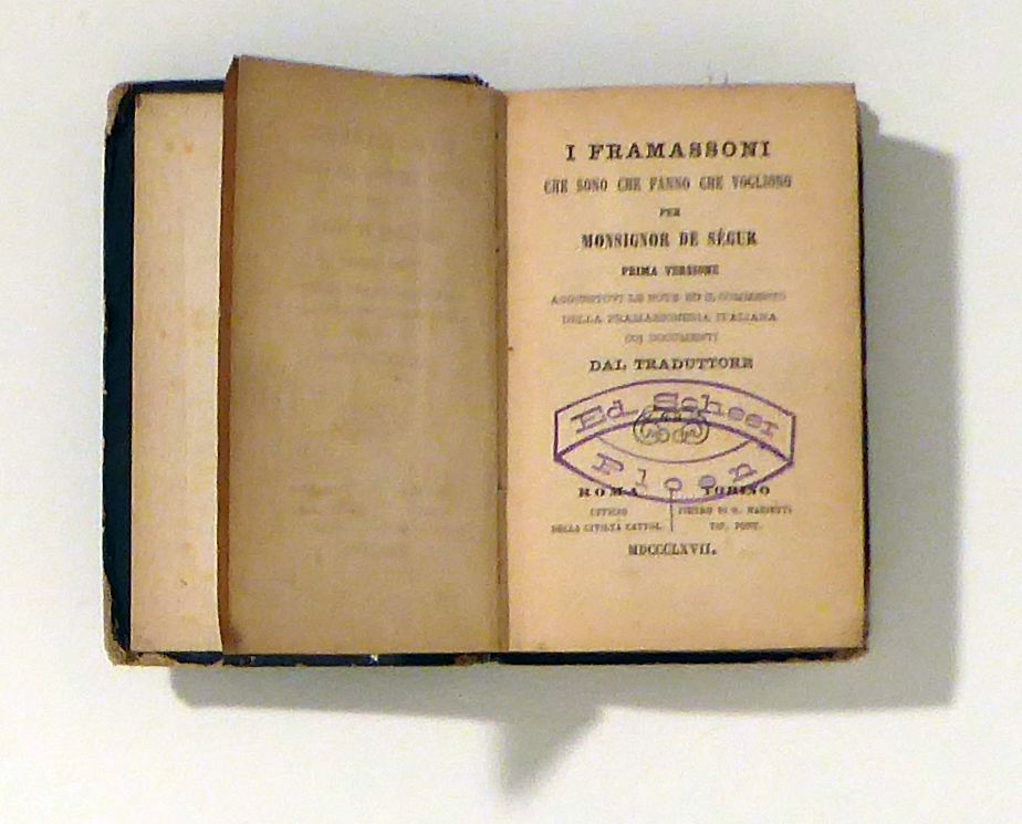 Che sono, che fanno, che vogliono. Per Monsignor [Louis Gaston Adrien] De Segur. Prima Versione. aggiuntovi le note ed il commento della framassoneria italiana coi documenti dal traduttore. Roma; Torino: Ufficio della civiltà cattolica; G. Marietti, MDCCCLXVII [1867]. XIX, 414, [2] SA., Einband: Original-Pappband. Format: 16° (8 x10 cm) (bxh). [=Die Freimaurer, wer sie sind, was sie machen, was sie wollen] Italienische Ausgabe eines in Frankreich in unzähligen Auflagen erschienenen Werks des katholischen Anti-Freimaurertums