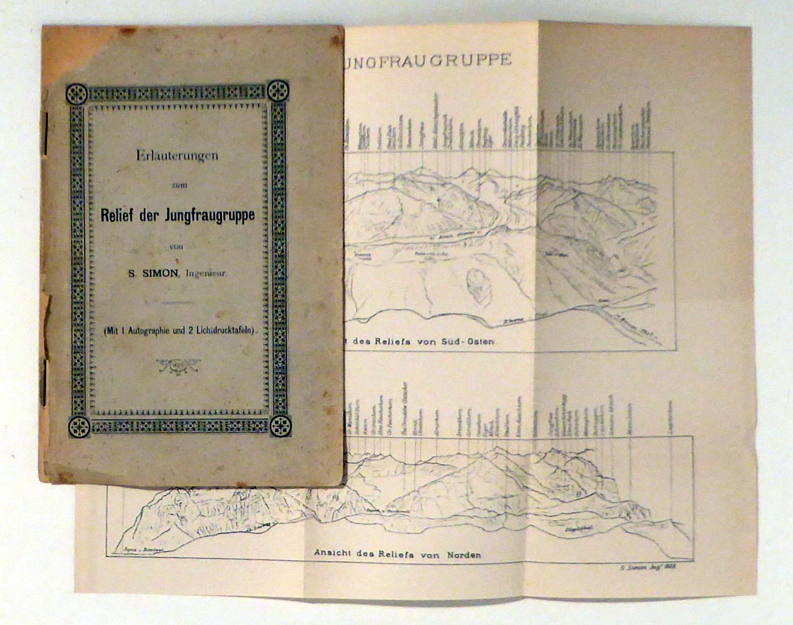 Mit 1 Autographie und 2 Lichtdrucktafeln. o.O.: o.V., [1888]. 12 S., Einband: Original-Broschur, klammergeheftet. Format: kl.8°. Veröffentlicht anlässlich der Ausstellung des Reliefs des Berner Oberlandes im Massstab 1:10000 in der Basler Kunsthalle (Reliefkatalog N° 270). Mit einem Panorama mit Ansichten von Süd-Ost und Norden sowie zwei Abbildungen nach Fotografien mit Ansichten vom Rhonetal und vom Grindelwaldtal aus