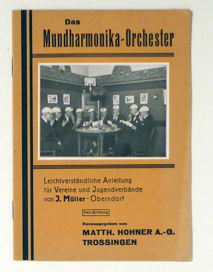 Leicht verständliche Anleitung für Vereine und Jugendverbände. Herausgegeben von Matth. Hohner AG, Trossingen. Trossingen: Matth. Hohner AG, 1930. 12 S., Umschlagtitel mit einer montierten Fotografie sowie im Text 2 Abbildungen nach Fotografien und von Objekten. Einband: Original kartoniert, klammergeheftet. Format: 8°. Erstausgabe. Knappe Anleitung für die vier ersten Stunden Musikunterricht für Mundharmonikaspieler. Ferner Hinweise, welche der Hohner-Instrumente für Vereinsorchester geeignet seien (Orchester I, Orchester II (Knittlinger Oktav) und Orchester III (Volle Orchesterstimmung