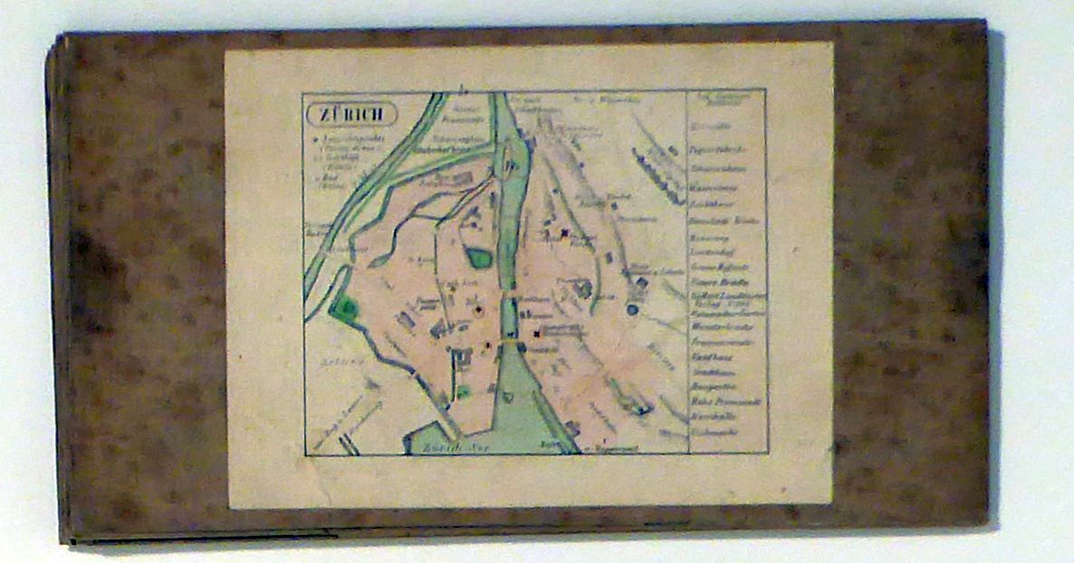 Gezeichnet und herausgegeben von Heinrich Keller in Zürich. vermehrt und berichtigt 1845. Zürich: Verlag bei Hch. Keller, 1845. 1 Blatt, Einband: Einblatt, in Steckschuber. Format: 40 x 55 cm (bxh), mehrfach gefaltet. Grenzkolorierter Kupferstich auf Papier, auf Leinwand aufgezogen. Mit 16 Detailplänen an den Rändern und einem auf den Leinwandrücken montierten Plan der Stadt Zürich; darin eingetragen in Deutsch und Französich Aussichtspunkte und Gasthöfe. Gezeichnet und herausgegeben von Heinrich Keller, Zürich. Titel auf dem Schuber: Keller's Karte des Cantons Zürich Q. Km 1723. Ausgabe von 1845. Zürich im Verlag bei Hch. Keller