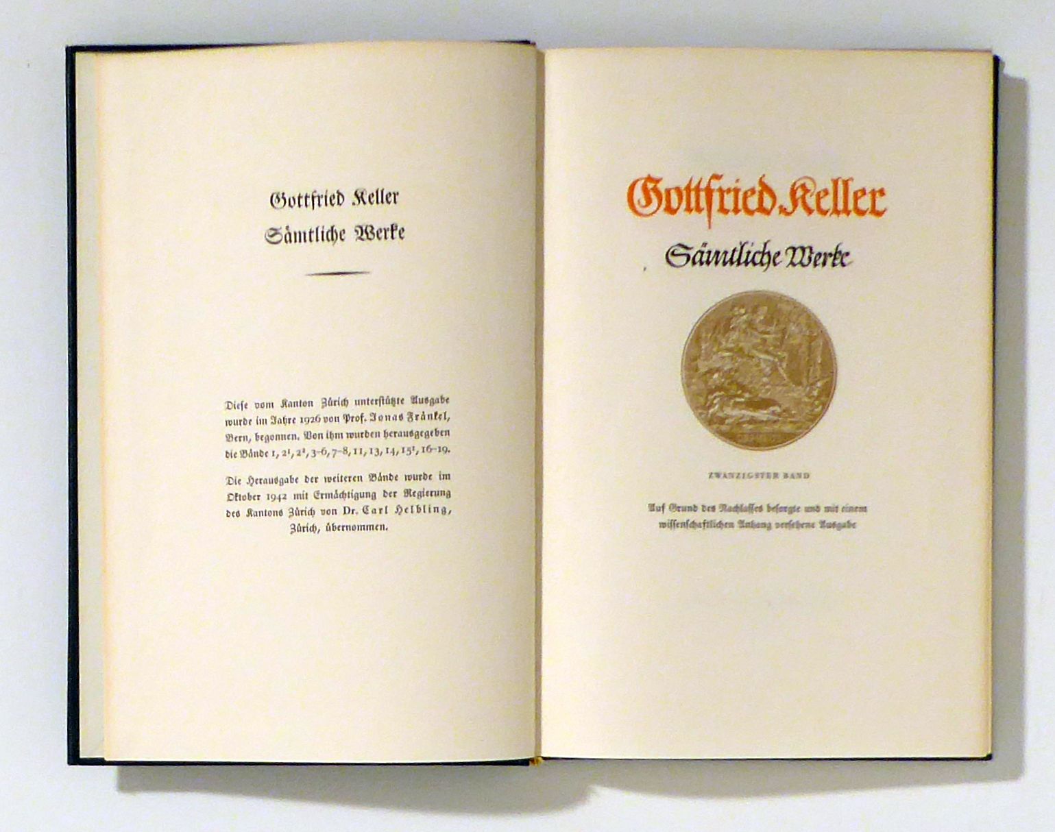 Bern; Lpz.: Benteli, 1946. 269[3] S., mit einer Titelvignette nach der Keller-Medaille von Arnold Böcklin in Holzschnitt. Einband: Blauer Or.Ln. mit Rückenvergoldung. Format: 8°. Reihe: Sämtliche Werke, auf Grund des Nachlasses herausgegeben von Jonas Fränkel. Zwanzigster Band.