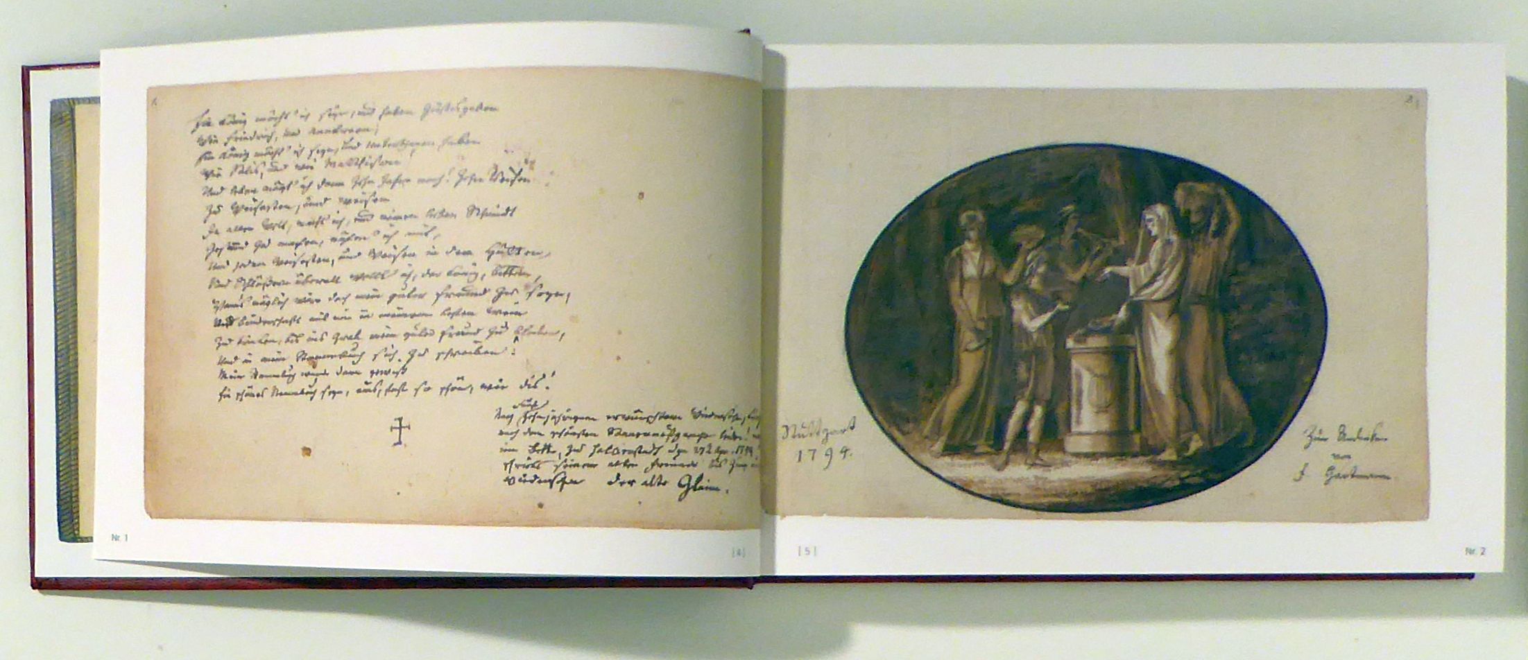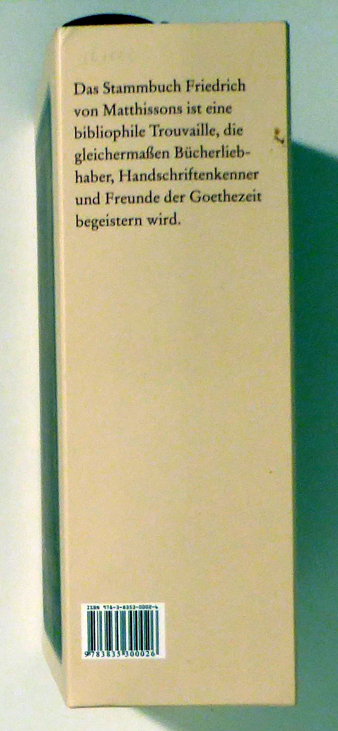 Herausgegeben, kommentiert und mit einem Nachwort versehen von Erich Wege, Doris und Peter Walser-Wilhelm sowie Christine Holliger in Zusammenarbeit mit Bonstettiana, Archiv und Edition sowie der Anhaltischen Landesbücherei Dessau. Göttingen: Wallstein, 2007. [351], 515 S., Kommentarband mit einem s/w Frontispiz und einer ganzseitigen s/w Illustration. Einband: Kunstleder; Original-Leinwand. Format: 8°, quer und 8°. Band 1 Das Stammbuch Friedrich von Matthissons als Faksimile; Band 2 Transkription und Kommentar zum Faksimile. Das Stammbuch Matthissons ist ein "prächtiges album honoratiorum, in welchem sich Matthisson von Koryphäen des civilisierten Europas Ehre erweisen lässt ..." Die 336 Einträge, von 1782 bis 1830, bieten "ein historisch und geoographisch reiches, interessantes Panorama der deutschen und schweizerischen Geistesgeschichte." (Nachwort) Mit ausführlichen Personen- und Ortsregistern