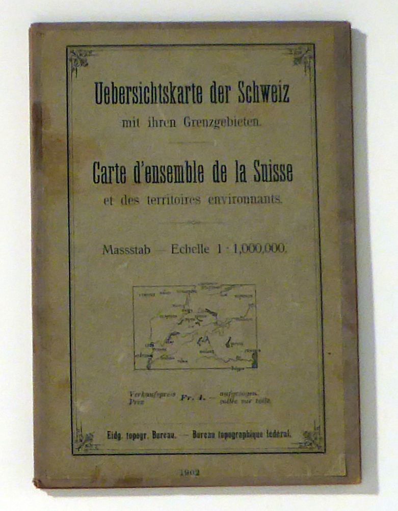 Carte d'ensemble de la Suisse et des territoires environnants. Massstab Echelle 1:1,000,000. [Bern]: Eidg. topogra[fisches] Bureau, 1902. Einband: auf Leinen aufgezogen. Format: 78 x55,5 cm (bxh); mehrfach gefaltet. Grenzkolorierte Karte der Schweiz, gezeichnet und gestochen von R. Leuzinger, Schrift [Georg] C[hristian] von Hoven. Basierend auf der Karte von 1878, mit Nachträgen von 1902