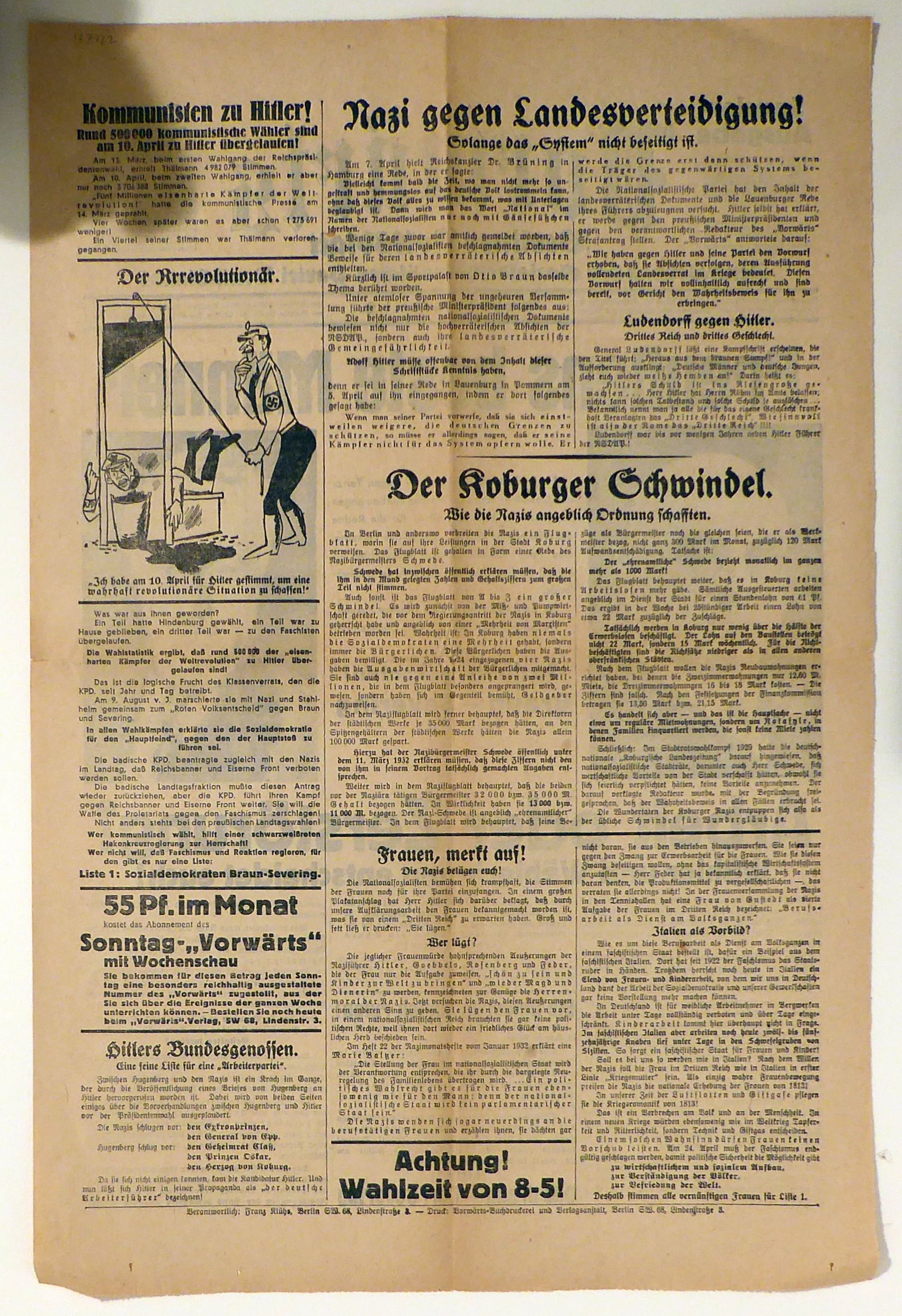 Vorwärts. Berliner Volksblatt. Zentral-Organ der Sozialdemokratie Deutschlands. Bln.: Vorwärts Buchdruckerei, 1932. 1 Bl., Einband: Einblatt. Format: 2°. Reihe: Vorwärts, Sonderausgabe, Sonnabend, 23. April 1932.