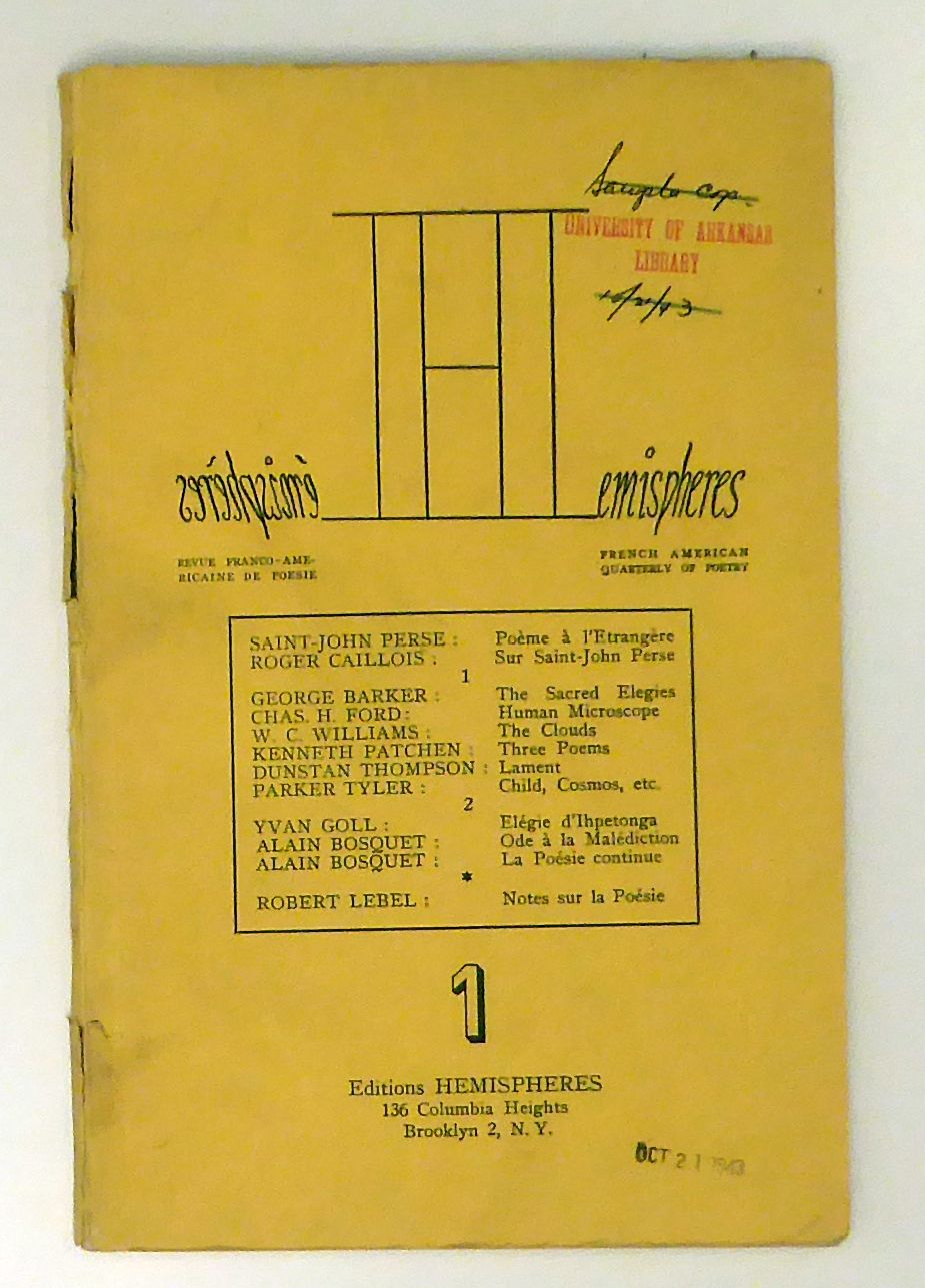 Revue Franco-Américaine de Poésie French American Quarterly of Poetry. Brooklyn: Editions Hemispheres, 1943. 63, [1] S., Einband: Original-Broschur. Format: 8°. Reihe: Hemispheres 1 1943.