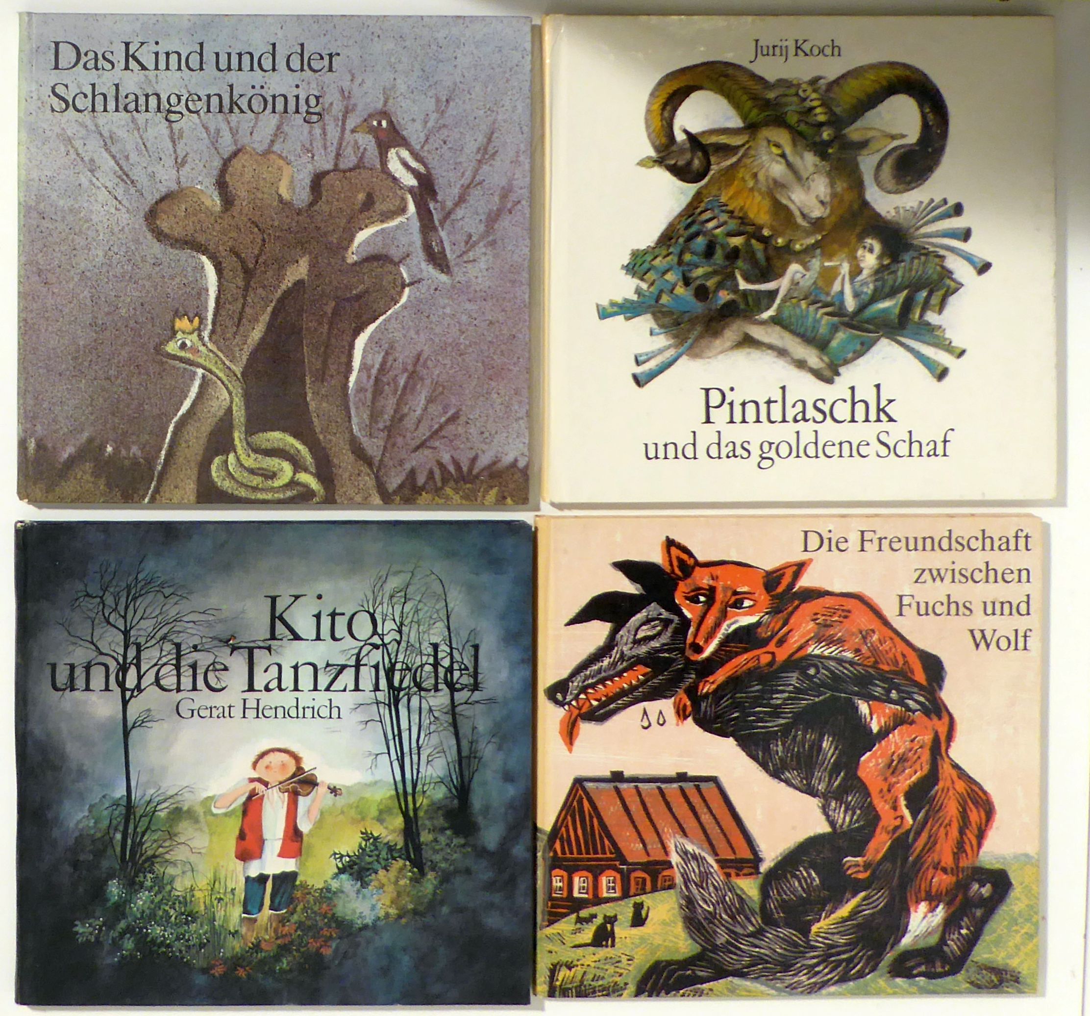 Konvolut 4 Bände aus der Reihe "Bajka" des Verlags Domowina in deutscher Sprache. Budyšin: Domowina, 1982-1983. 4 Bde., meist 24 S., jeder Band mit zahlreichen farbigen, meist ganzseitigen Illustrationen nach Zeichnungen von Renate Grube-Heinecke, Jutta Mirtschin, Norbert Pohl, Werner Schinko,. Einband: Original-Pappband. Format: 8°, quadratisch. Reihe: Bajka.