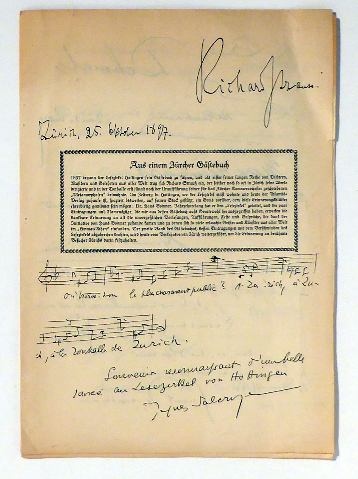 [Zürich]: o.V., o.J.. [8] S., Einband: lose Bogen. Format: gr.8°. Zwei Doppelbogen mit Faksimile von Einträgen in das Gästebuch des Lesezikels Hottingen.Denersten Eintrag machte - am 25. Oktober 1897 - Richard Strauss, als letzter ist der von Eleanora Roosevelt vom April 1948 wiedergegeben. Weitere stammen von Jacques Dalcroze, Henry Van der Velde, Ricarda Huch, Rainer Maria Rilke, Oswald Spengler, Luigi Pirandello, Thomas Mann, Benedetto Croce, Paul Valéry, Le Corbusier, Colette, Winston Churchill und zahlreichen anderen. Gewidmet sind die beiden Bogen Hans Bodmer, der den Lesezirkel Hottingen 1882 zusammen mit Wilfried Treichler gegründet hatte. Wann und wer dieses Faksimile veranstaltet hat, liess sich leider nicht ermitteln.