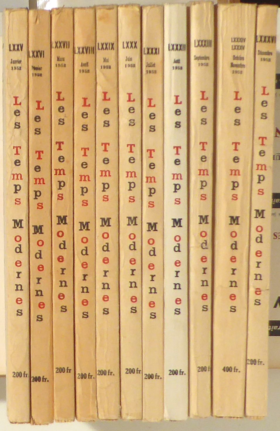 Revue mensuelle: Directeur Jean-Paul Sartre. Paris: Temps Modernes, 1952. 11 vol.; p. [1153]-2304, [1]-1152, Einband: Original-Broschur. Format: 8°. Reihe: Les Temps Modernes, 7e et 8e année, N° 75-86, Janvier-décembre1952.