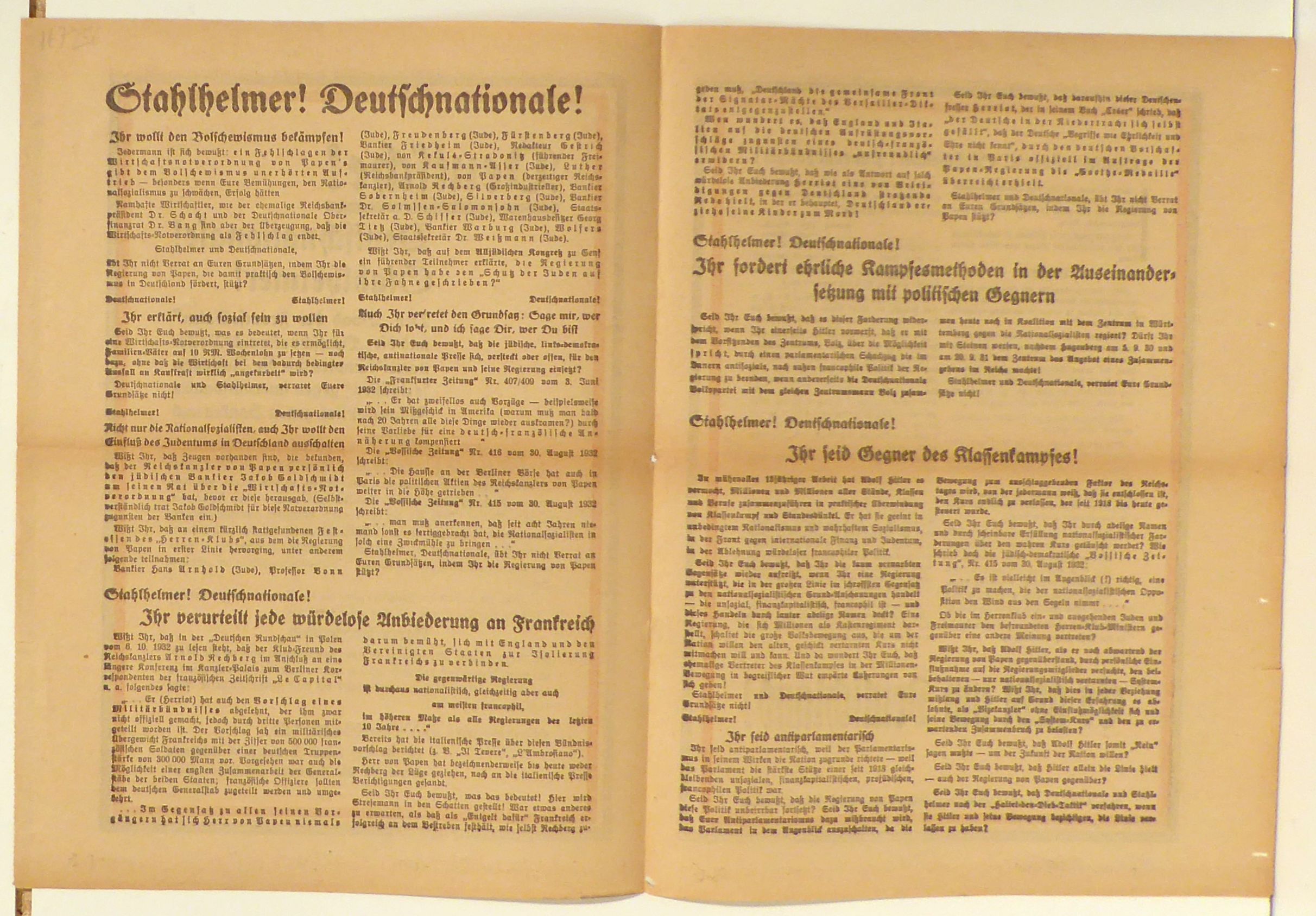 Objekt, Schlagwörter, Zeit, Sprache, Personen: Flugblatt: Politik und Zeitgeschichte, Propaganda, Weimarer Republik, Faschismus, DNVP - Deutschnationale Volkspartei, NSDAP (Nationalsozialistische Arbeiter-Partei); 20. Jahrhundert; Deutsch; Hess, Rudolf / Papen, Franz von