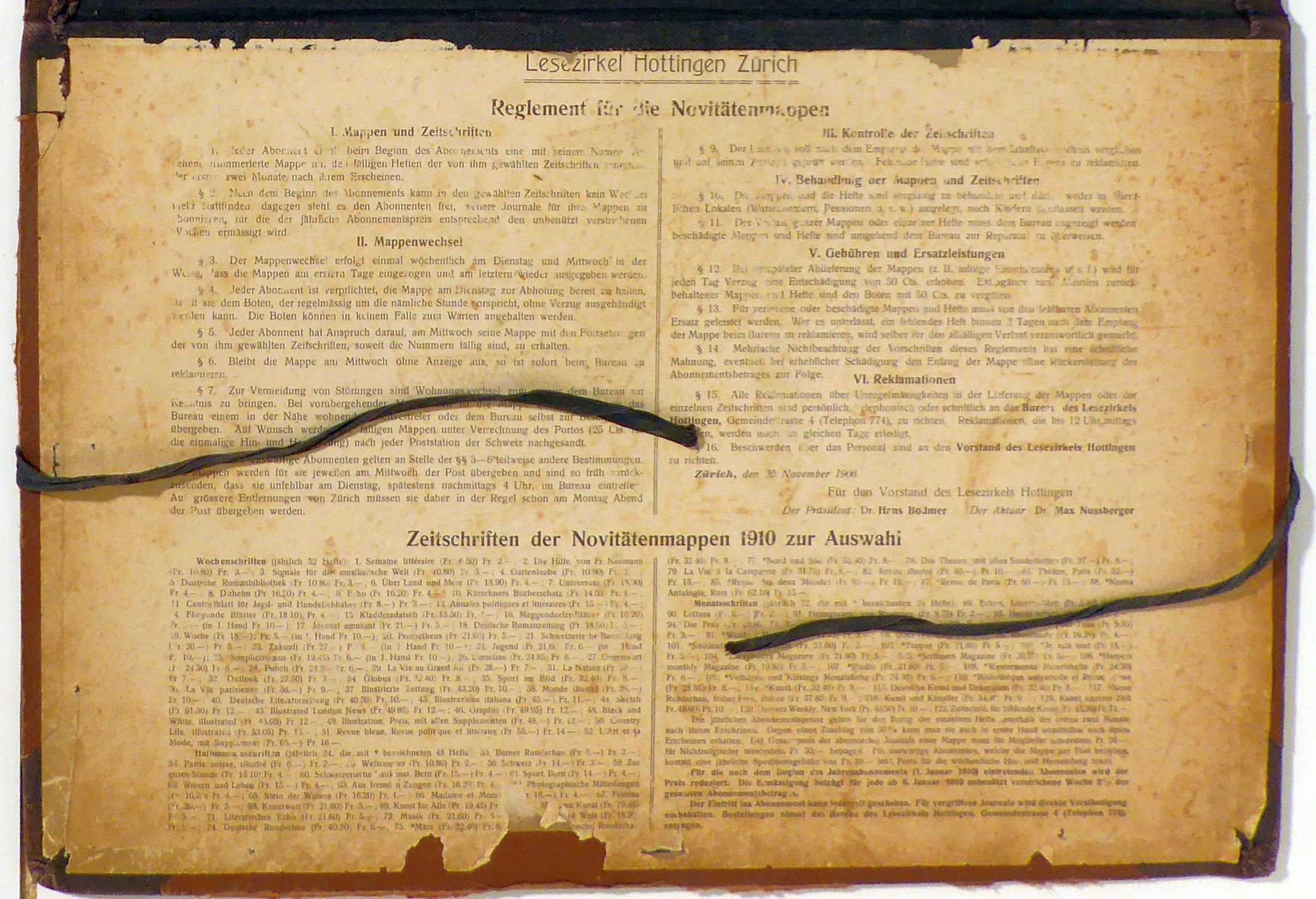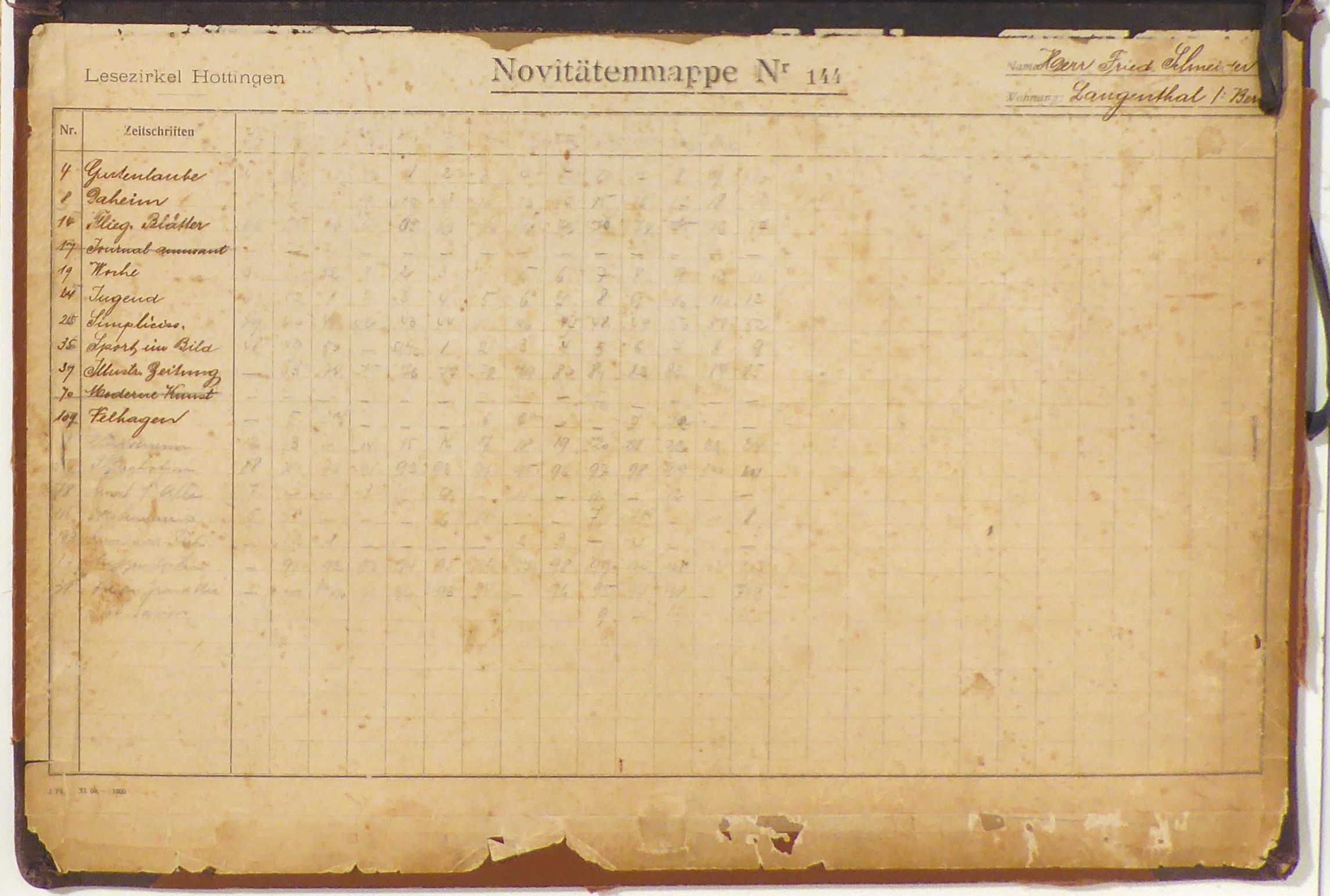 Novitätenmappe 144. Zürich: Lesezirkel Hottingen, [1910]. Einband: Original-Halbleinwand. Format: 30 x 44 cm (bxh). Erstausgabe. Bleuler-Waser (Lesezirkel Hottingen) S. 181. Zirkulationsmappe des Lesezirkels Hottingen für ein Mitglied in Langenthal im Kanton Bern. Er war Bezieher von "Gartenlaube", "Daheim", "Fliegende Blätter", "Journal amusant", "Woche", "Jugend", "Simplicissimus", "Sport im Bild", "Illustrierte Zeitung", "moderne Kunst" und "Velhagens & Klasings Monatshefte". Auf den Innenseiten montiert das Reglement für die Novitätenmappen und das Verzeichnis der angebotenen Periodika sowie die handschriftlich geführte Liste subskribierten Zeitschriften