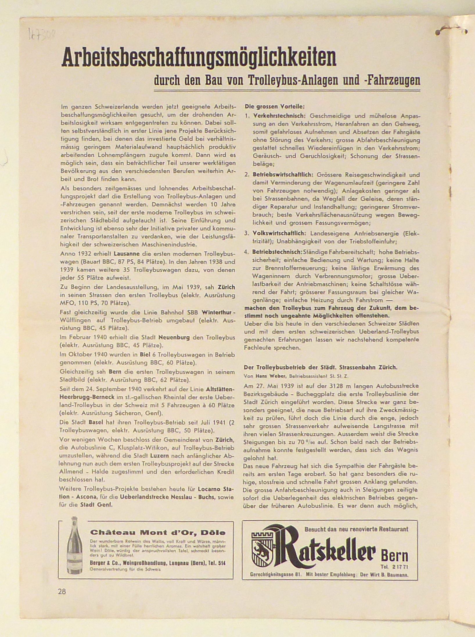 o.O.: o.V., um 1941. [27]-38 S., mit zahlreichen Abbildungen nach Fotografien. Einband: lose Bogen. Format: 4°. Aus einer nicht indentifizierten Zeitschrift herausgelöste Beilage über Trolleybus-Betriebe in der Schweiz mit den filgenden Artikeln: "Arbeitsbeschaffungsmöglkichkeiten durch den Bau von Trolleybus-Anblagen und -Fahrzeugen", "Les Trolleybus à Lausanne", "Der Trolleybus in der Berner Altstadt", "Ein Jahr Überlandtrolleybus im Rheintal", "Trolleybus-Projekt Toggenburg-Werdenberg", "45 Jahre schweizerischer Automobilbau", "Beschreibung von Trolleybus-Kontaktanleitungen, System BBC"