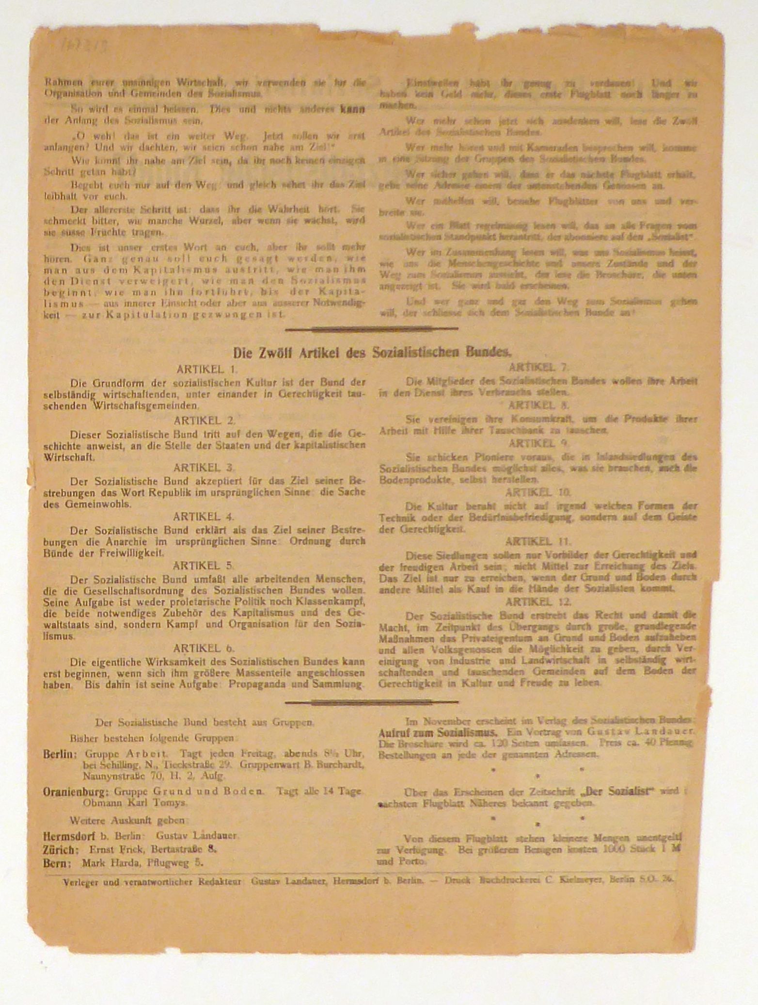 Was will der Sozialistische Bund. Berlin: Gustav Landauer, Buchdruckerei C. Kielmeyer, [1908]. 1 Bl., Einband: Einblatt. Format: 23x32 cm (bxh). Anschliessend an die Ziele die zwölf Artikel des Sozialistischen Bundes Angaben über die Organisationsform in Gruppen. Bei der Gründung gab es Gruppen in Berlin (Gruppenwart B. Burchardt), Oranienburg (Karl Tomys), Hermsdorf (Gustav Landauer), Zürich (Ernst Frick) und Bern (Mark Harda). Der Sozialistische Bund wurde 1908 gründet, zu den Gründern gehörten Gustav Landauer, Erich Mühsam, Martin Buber und Margarethe Faas-Hardegger