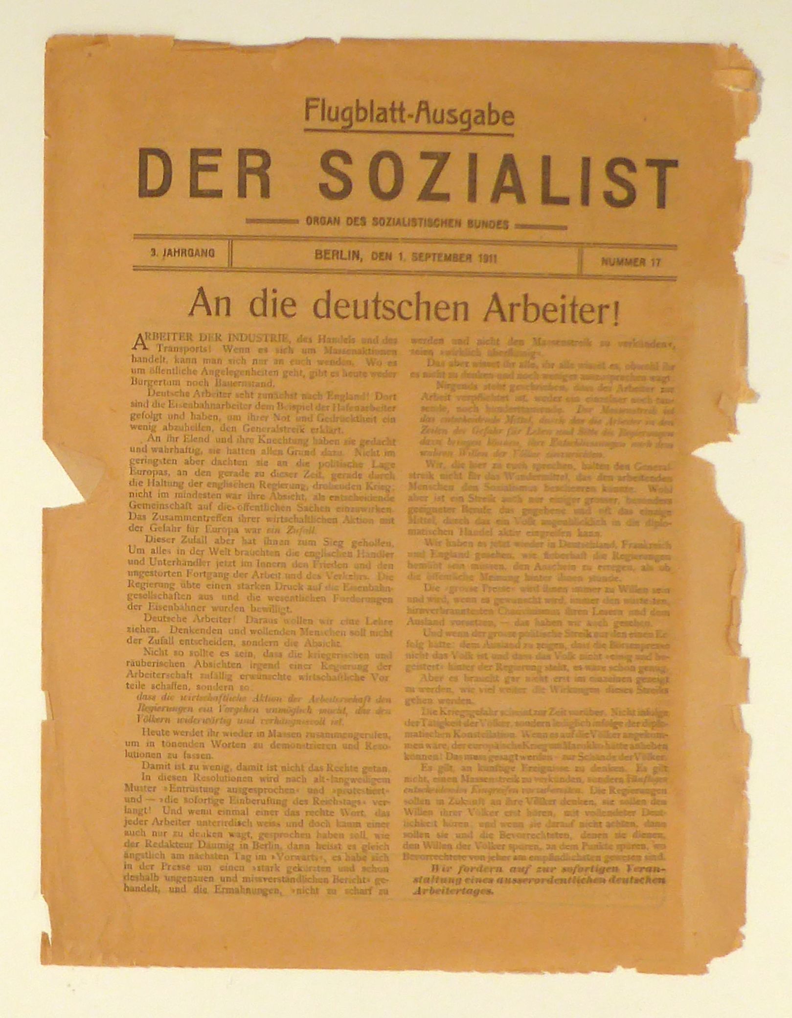 Berlin: GustavMax Müller, Drucker: Wilhelm Habicht, 1911. [2] S., Einband: Einblatt. Format: 23x31cm (bxh). Reihe: Der Sozialist, 3. Jahrgang, Nummer 17, 1. September 1911.