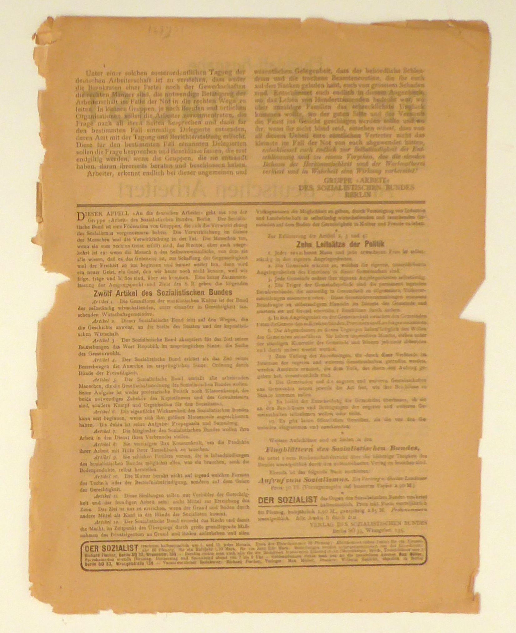 Anschliessend an den Aufruf der Gruppe "Arbeit" des Sozialistischen Bundes Berlin werden die zwölf Artikel des Sozialistischen Bundes und die zehn Leitsätze zur Politik abgedruckt. Der Sozialistische Bund wurde 1908 gründet, zu den Gründern gehörten Gustav Landauer, Erich Mühsam, Martin Buber und Margarethe Faas-Hardegger