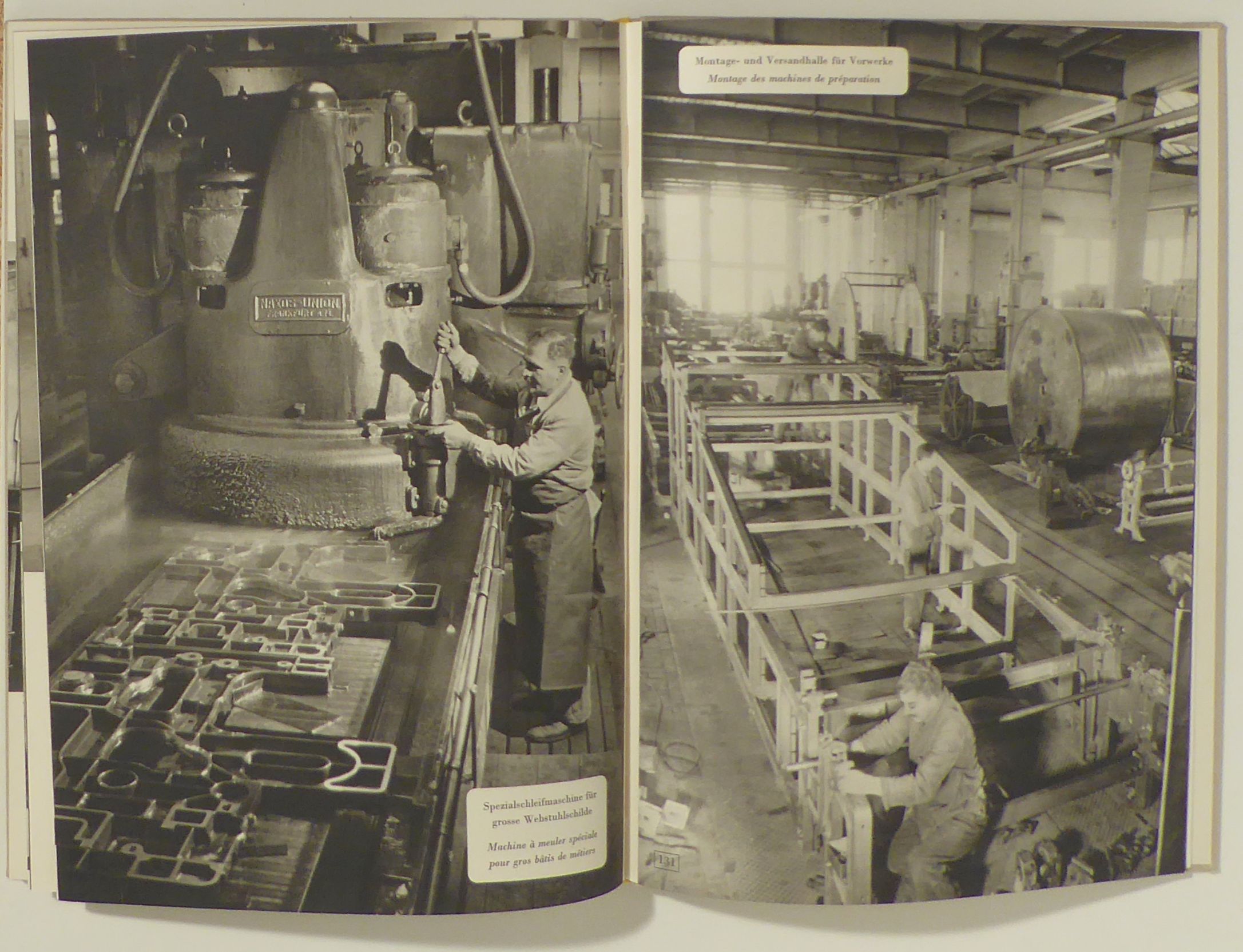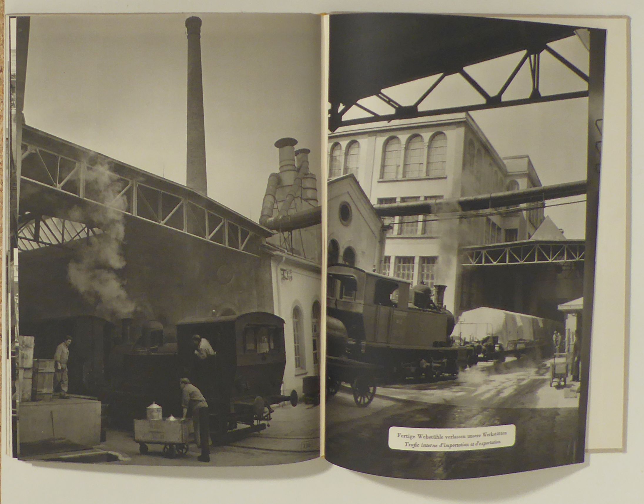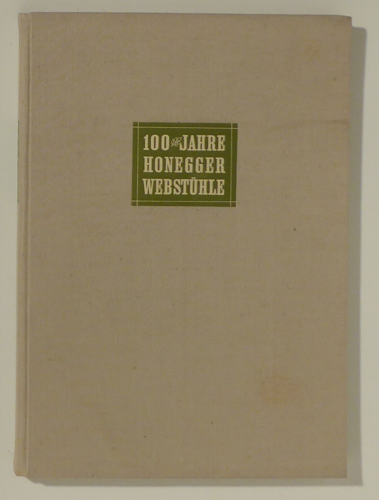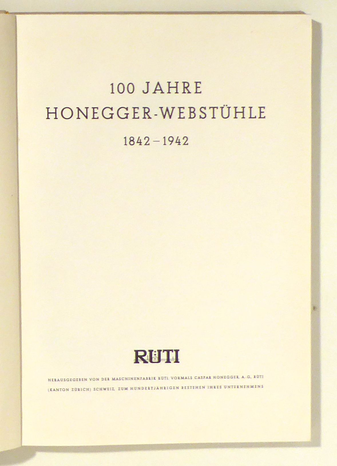Herausgegeben von der Maschinenfabrik Rüti, vormals Caspar Honegger, AG, (Kanton Zürich) Schweiz, zum hundertjährigen Bestehen ihres Unternehmens. Rüti: Maschinenfabrik Rüti, 1942. 144 S., mit 3 ganzseitigen farbigen Tafeln, ca. 150 Abbildungen nach s/w- Fotografien sowie 50 Abbildungen im Tiefdruck nach Fotografien von Jakob Tuggener. Einband: Original-Leinwand. Format: 4°. Erstausgabe. Umfangreiche Dokumentation zur 100jährigen Geschichte der Webstuhl-Fabrik Honegger. Neben verschiedenen Texten zur Geschichte 150 Abbildungen der fabrizierten Maschinen und Geräte und einer ungefähr 100 Namen zählende Liste der Angestellten, Werkmeister und Arbeiter, die 1942 40 und mehr Dienstjahre hatten. Im dritten Teil, "Aus unserem heutigen Betrieb - mit der Leica durch unsere Werkstätten" ein Portofolio von 50 Abbildungen, davon eine doppelblattgross und einige blattgross, im Tiefdruck nach Fotografien von Jakob Tuggener. Buchgestaltung: Maxine Fleury