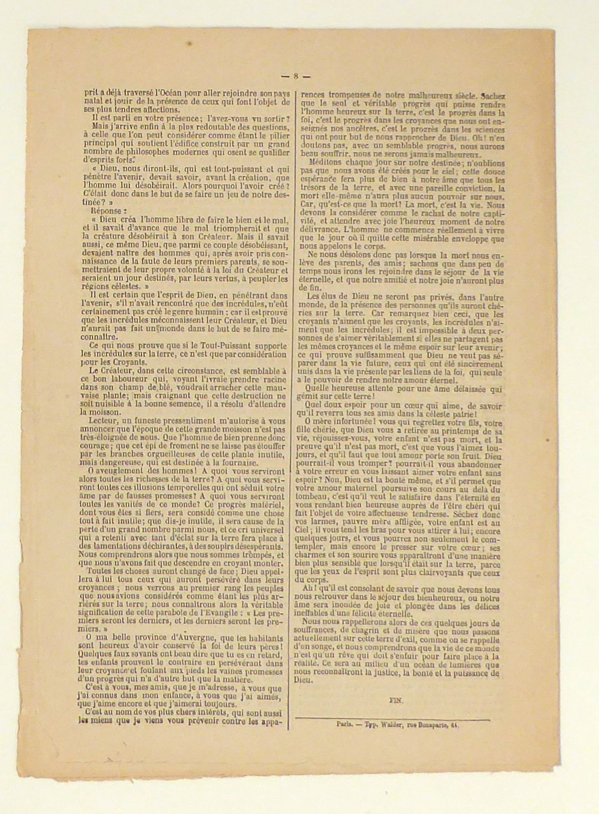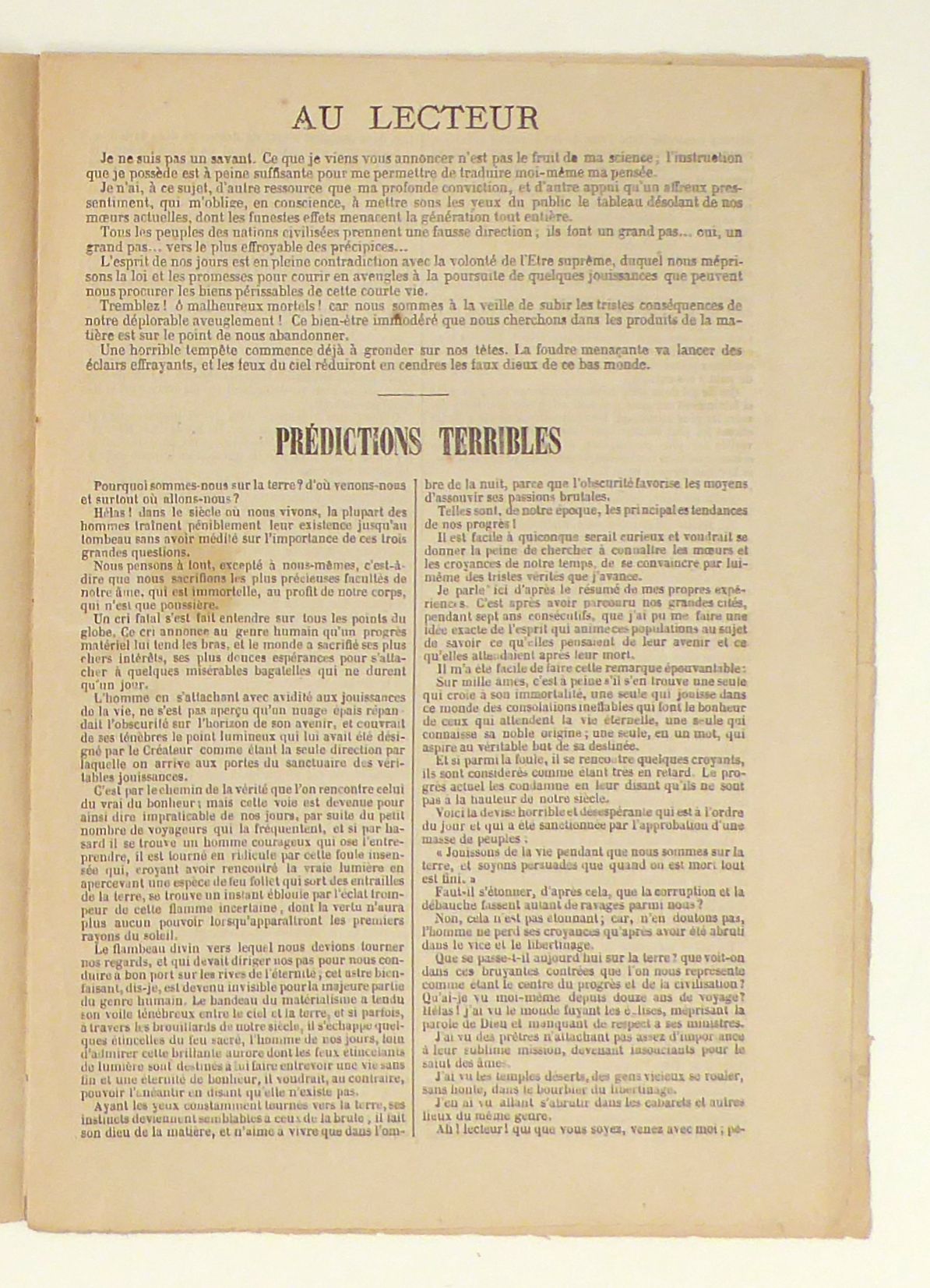 Révélations épouvantables sur ce que nous allons devenir. Par Jean Chabrit auteur de "L'étrange apparition". Paris: Typ. Walder, [1970]. [8] p., Einband: lose Bogen. Format: 4°. Erstausgabe. Warnung vor dem drohenden Weltuntergang wegen des sündigen Verhaltens der Menschheit. Im Hinweis an die Leser heisst es: "Tous les peuples des nations civilisées prennent une fausse direction; ils font un grand pas.... oui, un grand pas... vers le plus effroyable des précipices... [...] Une horrible tempête commence déjà à gronder sur nos têtes. La foudre menaçante va lancer des éclairs effrayantes, et les feux du ciel réduiront en cendres les faux dieux de ce bas monde." Vom gleichen Autor stammen auch "Avénement de l'Antéchrist" und "Étrange Apparition. Les Morts ressuscitent, preuve frappante de l'existence d'une autre vie" und weitere ähnliche Schriften