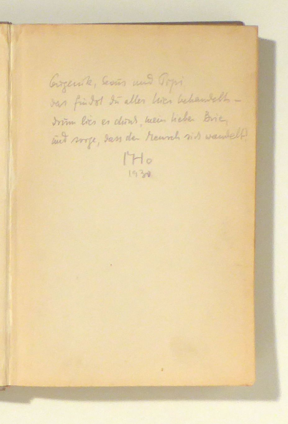 Erziehungshygiene und Gesundheitspolitik. Gesammelte Aufsätze und Vorträge (1916-1927). Rudolstadt: Greifenverlag, 1928. 256 S., Einband: Original-Leinwand. Format: 8°. Erstausgabe. Mit einer datierten, eigenhändigen mehrzeiligen, gereimten Widmung des Autors auf dem fliegenden Vorsatz: Eugenik, Sexus und Pipi, das findest du alles hier behandelt - drum lies es durch, mein lieber Brie, und sor ge, dass der Mensch sich wandelt! MH 1930