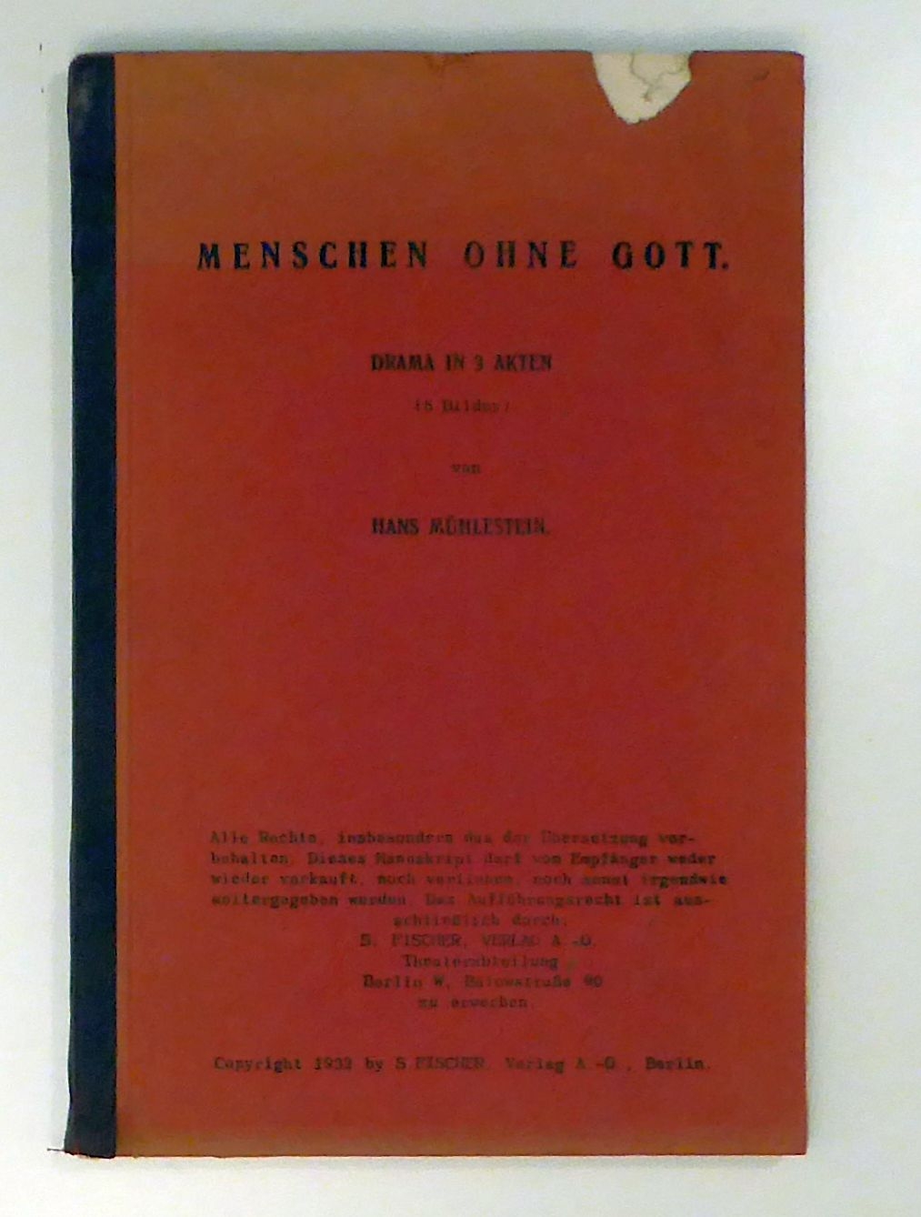 Drama in drei Akten. Bln.: S. Fischer, 1932. 100 einseitig bedruckte Seiten, mit einer Fotocollage auf dem Schutzumschlag. Einband: Original kartoniert. Format: 8°. Erstausgabe. Kritische Auseinandersetzung mit Stalin. Typoskript. Mit einer eigenhändigen, datierten Widmung an seine Frau Anita [Mühlestein]