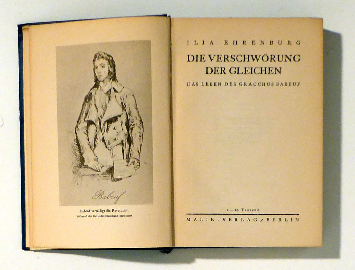 Das Leben des Gracchus Babeuf. Übersetzung aus dem Russischen von Hans Ruoff. Bln.: Malik, 1929. 289, [1] S., [4] S. Verlagsanzeigen; mit Lesebändchen, mit illustrierten Vorsatzpapieren, Titelportrait und 8 s/w Abbildungen auf 4 Tafeln nach alten Dokumenten. Einband: Blauer Or.Ln. mit Rückenvergoldung. Format: 8°. Erste deutsche Ausgabe. - Hermann 66. - Malik-Katalog 213