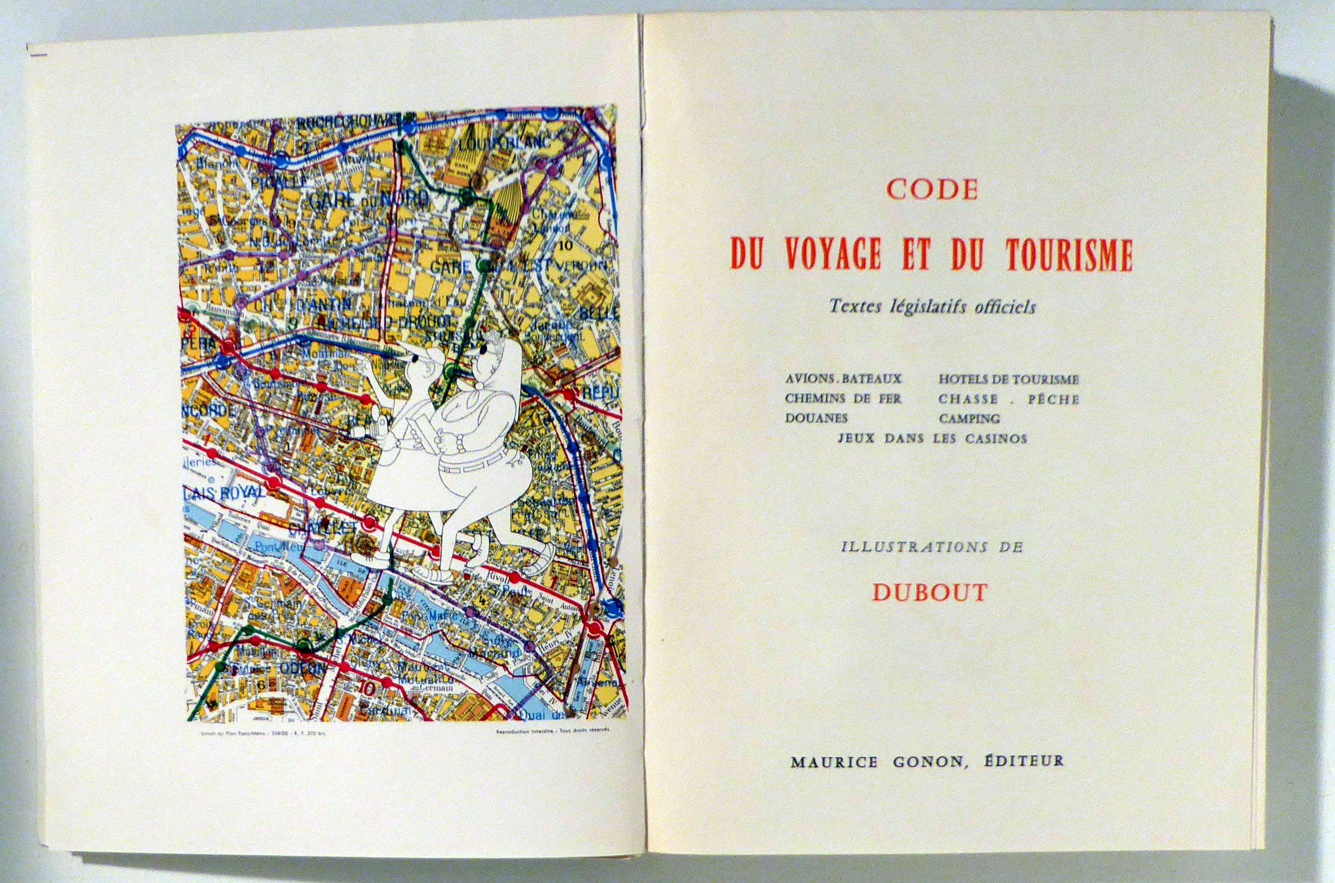 Textes législatifs officiels. Avions - Bateaux - Chemins de fer - Douanes - Hôtels deTourisme - Chasse - Pêche - Camping - Jeux dans les Casinos. Illustrations de Dubout. Paris: Maurice Gonon, 1960. [4], 239 [4] S., mit farbig illustrierten Vorsatzpapieren und zahlreichen, meist ganzseitigen farbigen Illustrationen von Dubout. Einband: Farbig illustr. Franz. Or. Broschur in illustriertem Schmuckschuber. Format: 4°. Tirage limité, Exemplaire N° 374 des 800 réimposés sur vélin chiffon de Lana, accompagnés d'une suite en noir du trait des 28 hors-texte, sous emboîtage illustré par l'artiste. Broché sous couverture illustrée et emboîtage décoré de l'éditeur, feuillets non coupés