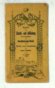 Hrsg. vom Verschönerungs-Verein von Zürich und Umgebung für dessen Mitglieder. III. Auflage. Winterthur: Kartographia Winterthur AG, 1909. 1 mehrfach gefaltetes Blatt, Farblithographierte Karte, umseitig ein zweiteiliges Umrisspanorama, 1896 aufgenommen und in Stein gestochen von Albert Bosshard. Einband: Or.kt. Format: 58 x 37 cm. Titelblatt mit einer stilisierten Bergansicht und Zürcher Wappen nach einer Zeichnung von Alfred Näf, auf dessen Rückseite eine Karte "Zürichberg bis Pfannenstiel" im Massstab 1:125'000